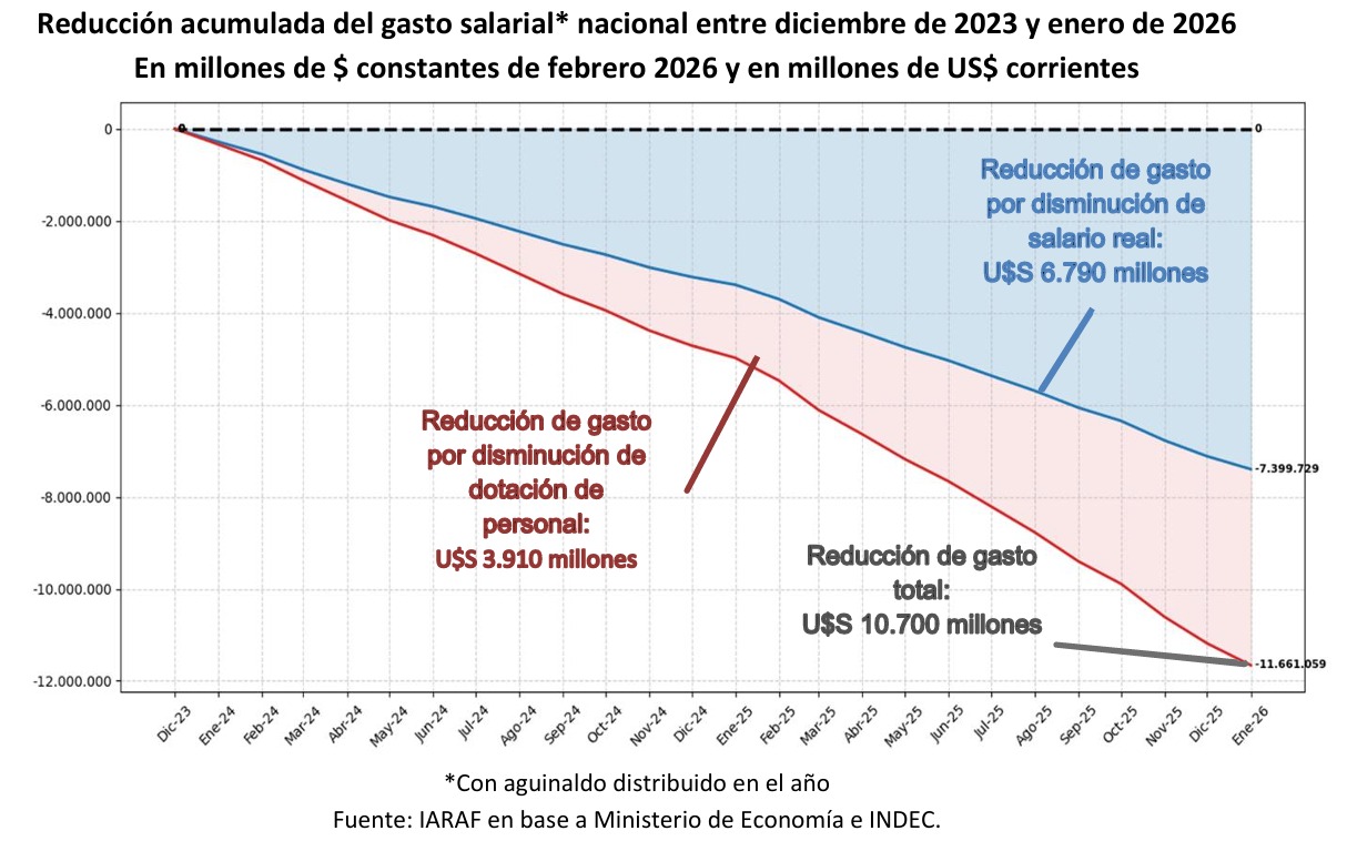 La reducción acumulada del gasto salarial del Sector público nacional no financiero fue equivalente a US$10.700 millones entre diciembre de 2023 y enero de 2026. El 36,5% fue explicado por la reducción de planta y el 63,5% por la reducción del salario rea