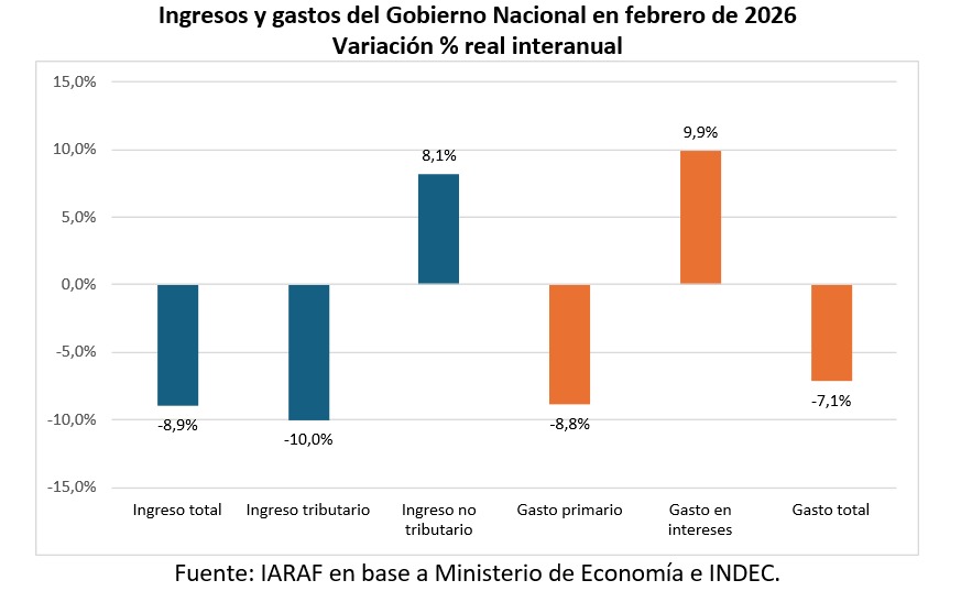 Bajas porcentuales reales interanuales del 9% tanto de ingresos como del gasto primario, durante el mes de febrero de 2026, derivaron en una merma real del 10% del superávit primario