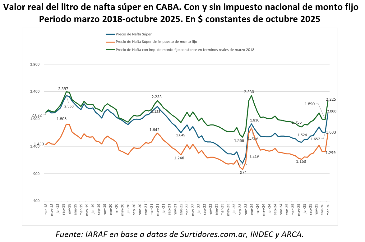 La nafta aumentó un 21% en términos reales en marzo debido a la guerra, lo que implica retornar a un nivel real de julio de 2021. Si se quisiera neutralizar este incremento, el impuesto fijo a los combustibles debería reducirse en un 95% en CABA.