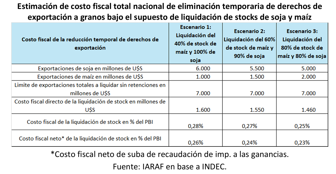 Reducción total temporaria de derechos de exportación a cereales y oleaginosas. El costo fiscal neto para nación sería de entre 0,23% y 0,26% del PBI. Lo imputable para los próximos 4 meses de 2025 sería de 0,14% del PBI