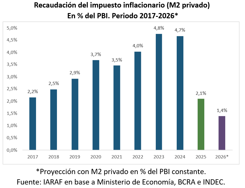 El impuesto inflacionario puede llegar a bajar 2,6 puntos porcentuales del PBI en el año 2025, constituyéndose en la principal baja impositiva, seguida en segundo lugar por el impuesto PAIS. En 2026 tendría un nuevo descenso.
