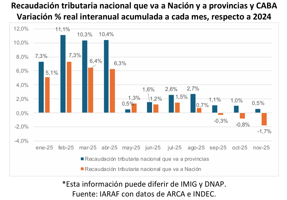La recaudación tributaria nacional total habría caído un 1% real en los primeros once meses del año respecto a 2024. Mientras la parte que va a provincias y CABA habría subido un 0,5%, la que termina en manos de Nación habría descendido un 1,7%.