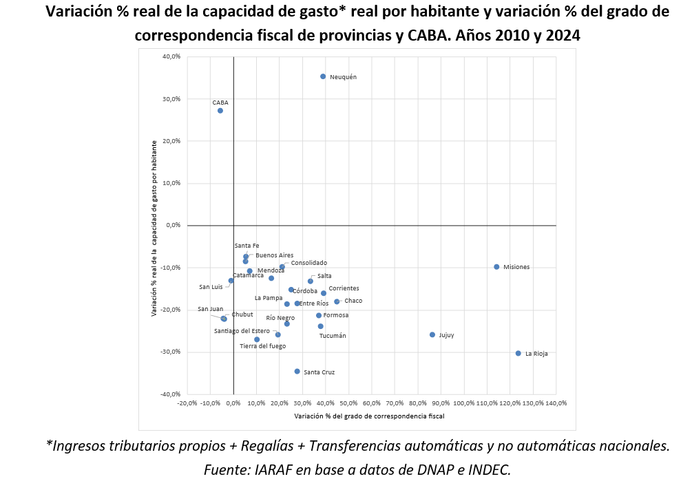 Documento N° 5 de 5: La capacidad efectiva de gasto público provincial cayó un 10% entre los años 2010 y 2024. Veinte jurisdicciones aumentaron su grado de correspondencia fiscal, básicamente como consecuencia de la significativa caída de las TNA.