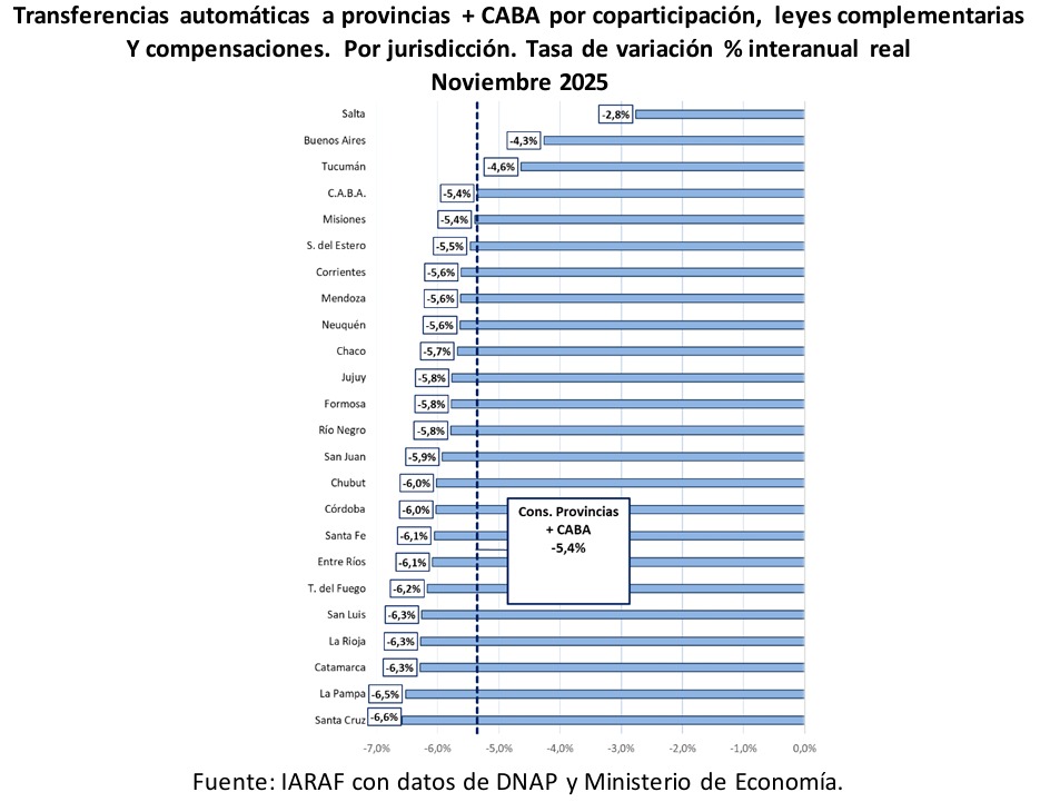 En noviembre las transferencias nacionales automáticas a provincias y CABA descendieron un 5,4% real interanual. En los primeros once meses del año las transferencias totales reales tuvieron un incremento del 1,5% respecto a 2024