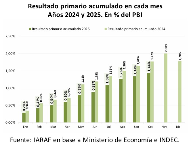 Dado una baja real interanual en los ingresos totales del 2,4% y una baja del gasto primario del 1,3%, el superávit primario del gobierno nacional tuvo un descenso del 16%. El superávit prim. acum. en los primeros diez meses sería de 1,4% del PBI.