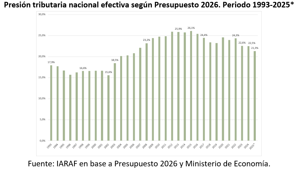 Proyecto de presupuesto 2026: La presión tributaria nacional efectiva descendería 1,2 puntos porcentuales del PBI durante 2025. La disminución de la recaudación por baja de impuestos se estima que sería de 1,4% del PBI