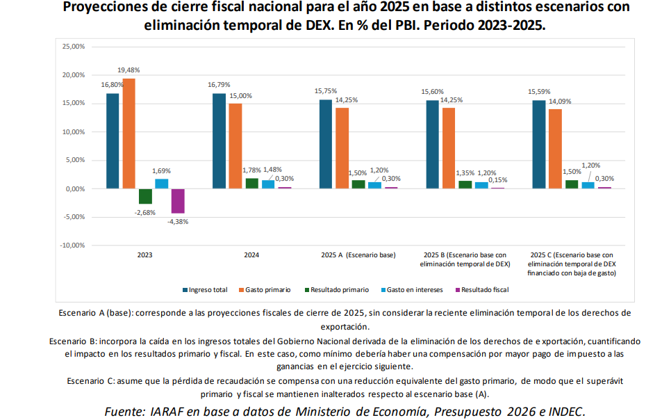 Dada una posible caída del 1% del PBI del ingreso total, para sostener un superávit primario de 1,5% del PBI, el gasto primario nacional real debería mantenerse constante, bajando 0,75% del PBI en 2025. El posible impacto de eliminación temporal DEX