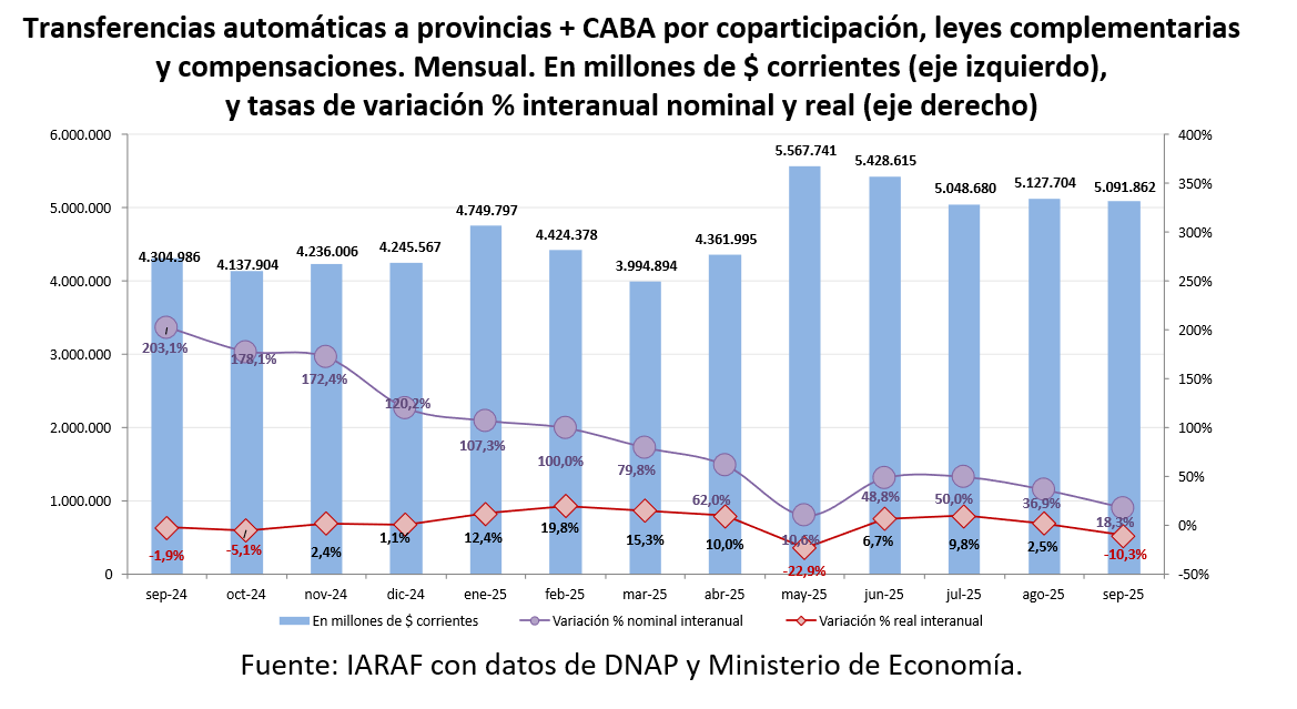 Debido a la recaudación del impuesto a los Bienes Personales, en septiembre las transferencias nacionales automáticas totales habrían caído un 10% real interanual. Si se quita del análisis a la recaudación de este impuesto, la suba es del orden del 1,8%