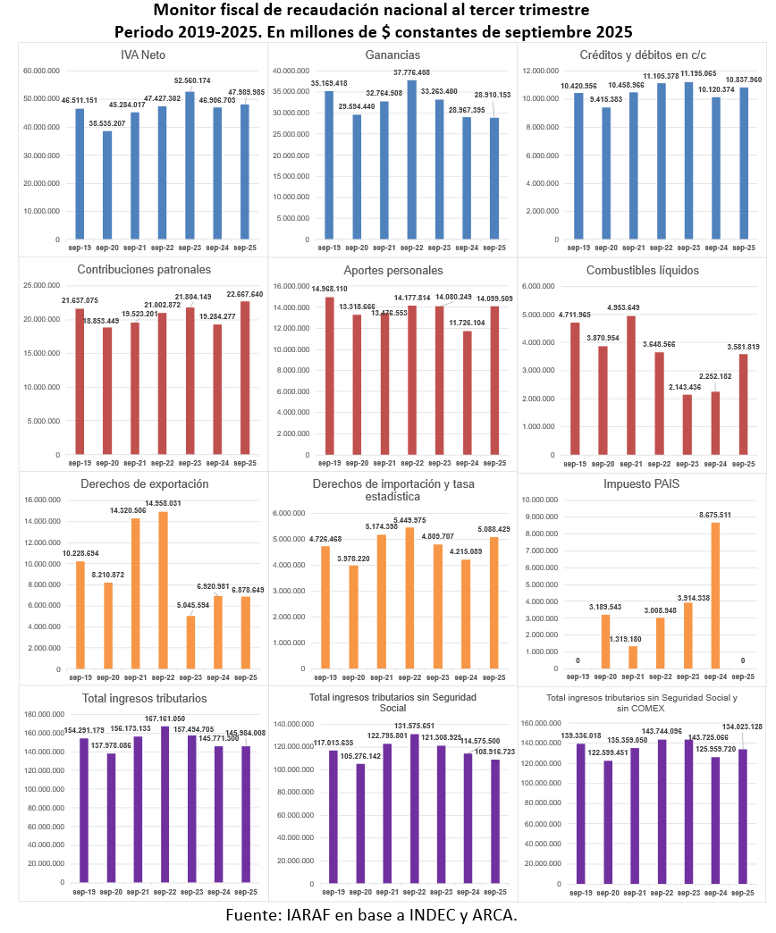 Monitor de recaudación tributaria nacional al tercer trimestre de 2025: La pérdida por impuesto PAIS fue compensada por aportes y contribuciones a la seguridad social, el impuesto a los combustibles e IVA.